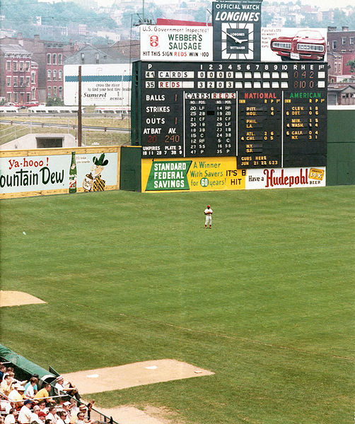 | | Phony Benoni: <OCF> Upon seeing the first picture, I had to figure out what game it came from. I'm not completely sold on Bill James and His Wacky Sabermathematicians. Some of their stats seem simply otherworldly. But the best thing they have done is stimulate an interest in preserving baseball's statistics, and thus its history. I could hang around places like Retrosheet all day just browsing the scores and the stats, and looking up all sorts of absurd things. At first, I was thought it would be from the 1950s after looking at the Mountain Dew Ad. However, I then saw Houston on the scoreboard and knew it had to be 1962-1971, when Crosley Field closed. We know the approximate date from seeing that Chicago is coming in for a series on June 21-23.