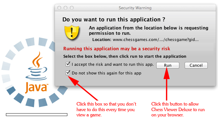 | | chessgames.com: Sorry for your frustration. I recently upgraded a Mac to Mountain Lion (or whatever the latest big feline is) and ran into a similar wrinkle. By the way, I think most of you guys already know this, but a lot of people are becoming frustrated because they fail to click the checkbox depicted in this graphic: http://www.chessgames.com/chessimag... Click that checkbox and it will stop nagging you. |